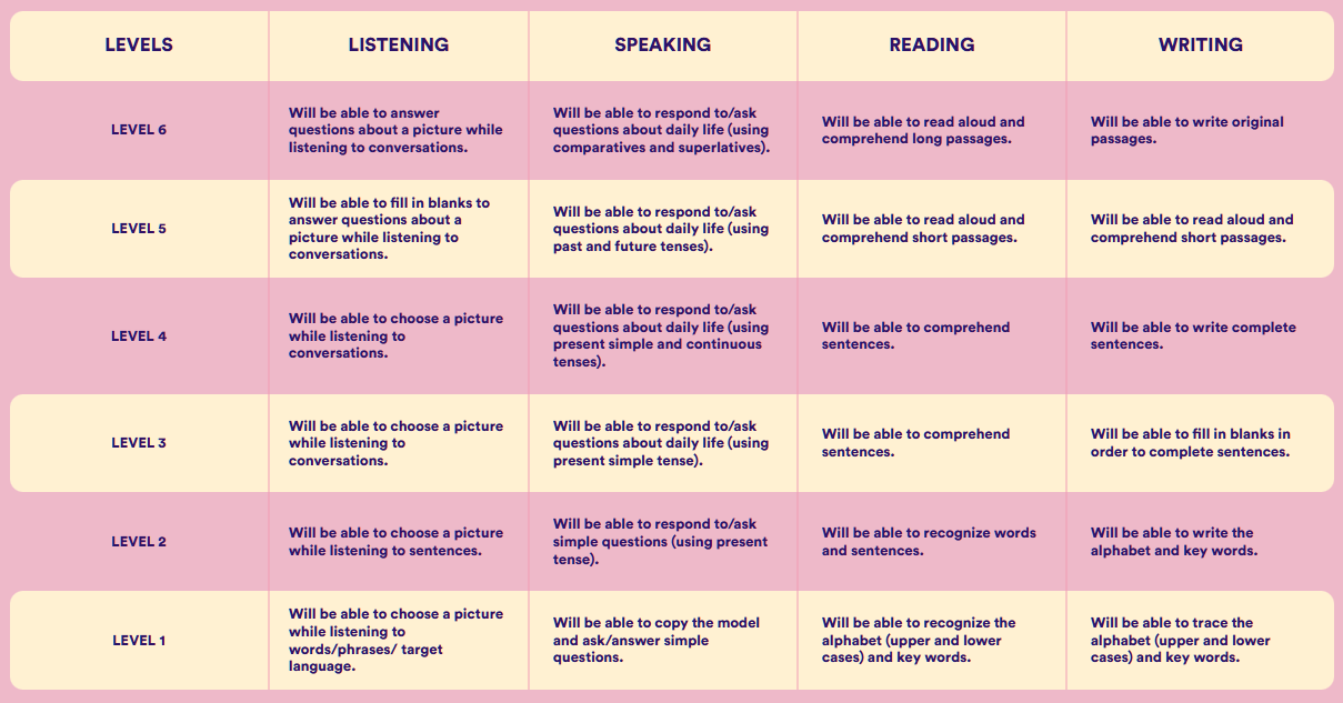 Across two terms per level, children grow through: